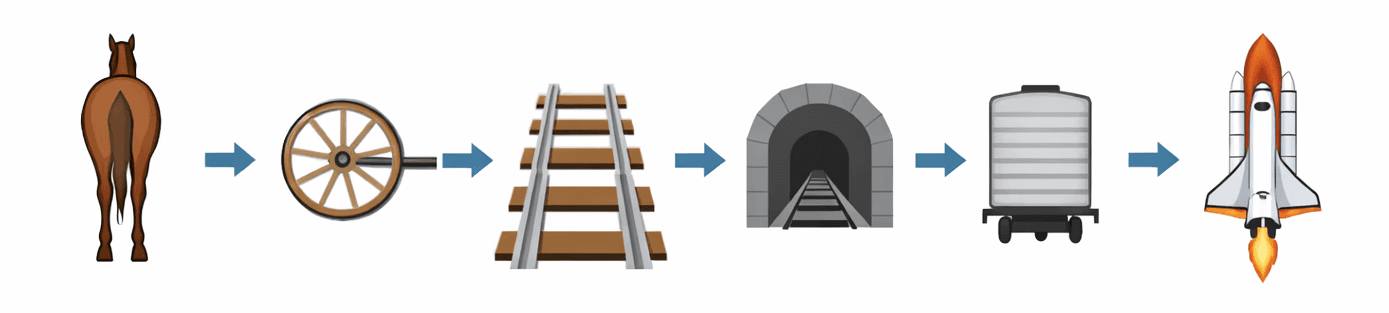 The space shuttle boosters were determined not by ideal engineering choices but instead by a long chain of historical constraints. The boosters must be transported by train, which limits their diameter through tunnels, those tunnel sizes came from old rail standard, which traced back to tram widths, which themselves were set by cart widths, which themselves were set by the spacing of horse-drawn carts and those carts were determined by the side of a horses bum! In short: The cutting-edge space vehicle was quietly shaped by a horses bum!